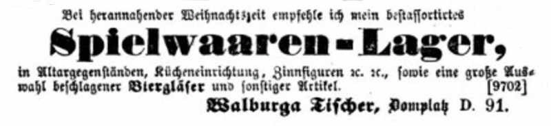 | 1870 | Walburga Tischer hat einen Laden gemietet im Haus C. 44 Untere Karolinenstraße/Hoher Weg, das dem Kaufmann Friedrich Keller gehört und Werkstatträume im Haus C. 130/131 Mauerberg, hier ist der Eigentümer Baumeister Ignaz Hosp. |