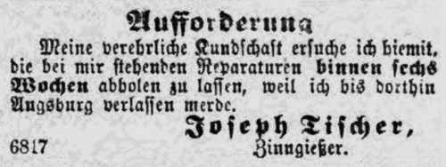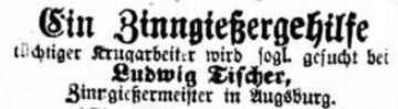 | 1825 | Auf der Industrie-Ausstellung in Augsburg im November 1825 erhält Johann Ferdinand Tischer "wegen eines nettgearbeiteten Säulen-Tempels aus Zinn mit der wohlgetroffenen Büste des höchstseligen Königs" ein Preis-Diplom. |