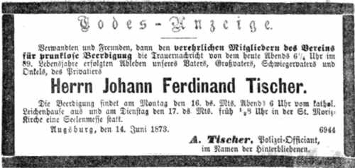 | 1873 | Johann Ferdinand Tischer stirbt am 14. Juni 1873. |