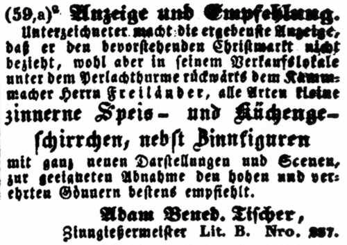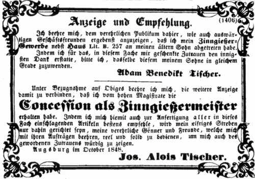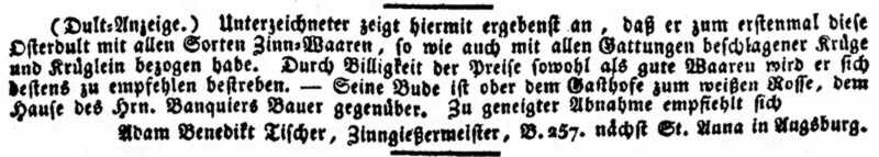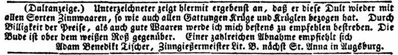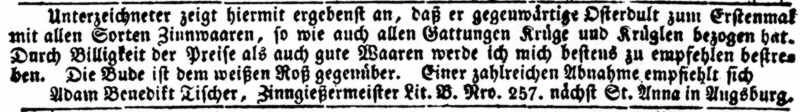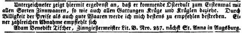 | 1843 | Der Nürnberger Kurier Nr. 14 vom 14. Januar 1843 vermeldet, dass "der Zinngießermeister, Porzellan- und Steingutwaarenhändler (Adam Benedikt) Tischer" (als Vertreter der katholischen Partei) mit fünf anderen Kaufleuten "in der Eigenschaft als bürgerliche Magistratsräthe der Stadt Augsburg bestätigt" wurde (für 1842 bis 1848). |