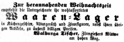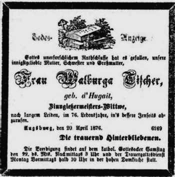 | 1876 | Die Zinngießerswitwe Walburga Tischer stirbt am 20. April 1876. |
