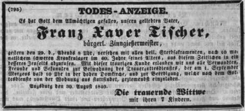 | 1798 | Franz Xaver Joseph Tischer, der das Zinngießerhandwerk erlernt hat, arbeitet als Geselle bei seiner Mutter. |