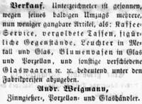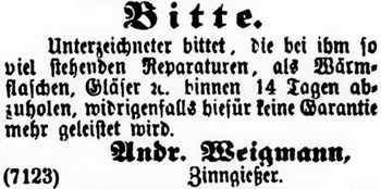 1882 | Johann Andreas Weigmann ist jetzt Privatier, Johann Stefan Weigmann ist Alleininhaber der Firma J. A. Weigmann, Zinngießerei, Hohlglashandel und Porzellanwarenhandlung. |