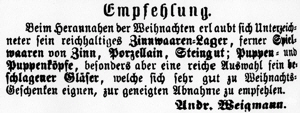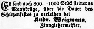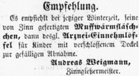 Johann Andreas Weigmann beteiligt sich an der Allgmeinen Deutschen Gewerbe-Ausstellung in Berlin mit "drei Schachteln Kinderhausrath zu 12 Kr., 42 Kr. und 2 Gld. die Schachtel und zwei Klistierspritzen aus Zinn". Er handelt neben der Zinngießerei auch mit Porzellan und Steingut. |