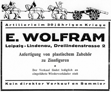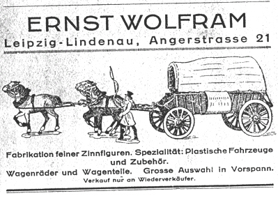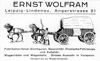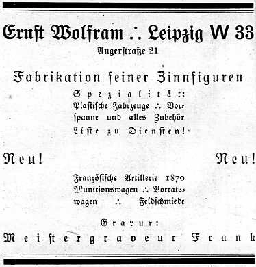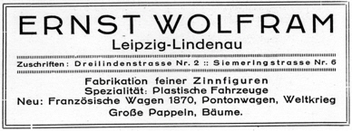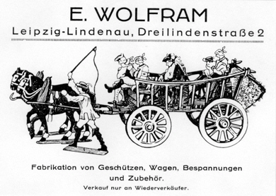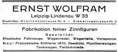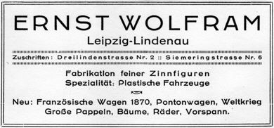 Der Gummidrechsler Ernst Wolfram (* 1869; † 1937) beginnt Mitte des Jahres mit der Anfertigung von plastischem Zubehör zu Zinnfiguren. Er wohnt und arbeitet in der Dreilindenstraße 2/I in Leipzig-Lindenau und zieht Ende des Jahres in die Angerstraße 21 um. |