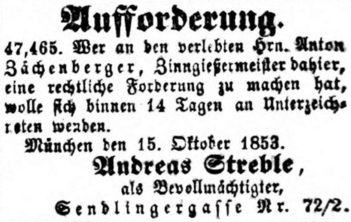 | Quellen: Erwin Hintze: Die Deutschen Zinngießer und Ihre Marken Band VI - Süddeutsche Zinngießer, Teil II: Künzelsau/Sulzbach, Leipzig, K.W. Hiersemann, 1921 - 1931 Matrikula: Kirchenbücher Kempten-St. Lorenz, Bad Aibling-Mariä Himmelfahrt, München-Hl. Geist Königlich-Baierischer Polizey-Anzeiger vom 3. April 1822 und 6. September 1829 Der Bayerische Volksfreund vom 28. April und 9. Juni 1825, 1. Juni 1830 Münchener Conversations-Blatt vom 22. und 23. Dezember 1831 Die Bayerische Landbötin vom 19. Dezember 1835, 21. Dezember 1839, 22. Dezember 1840, 22, Juni 1852, 2. Juli 1853 Neueste Nachrichten aus dem Gebiete der Politik vom 15. Oktober 1853 Münchener Anzeiger vom 22. Dezember 1853 |