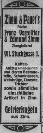 Die Zinn- und Bleigießer Josef Zimm & Heinrich Pauer haben ihre Firma im VII. Bezirk, Kirchengasse 42 und die Verkaufs-Niederlassung in der Naglergasse 12. Franz Zimm (II) arbeitet auch in der Firma J. Zimm & H. Pauer und wohnt Kirchengasse 42. |