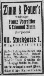 Die Zinnwarenfabrik, die wieder "sämtliche Artikel in Zinn und Blei" herstellt, firmiert unter Zimm & Pauer Nachf. - Franz Vorreiter & Edmund Zimm weiterhin im VII. Bezirk in der Siebensterngasse 50. Der Betrieb Edmund Zimm - Zinnwaren und Zinnfiguren ist in die Stuckgasse 3 umgezogen. |