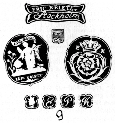 Meisterzeichen des Eric Pettersson Krietz vom 1. Februar 1754 bis 13. August 1805 (Bruzelli) Er stempelt sowohl drei- als auch vierfach [siehe unten] |