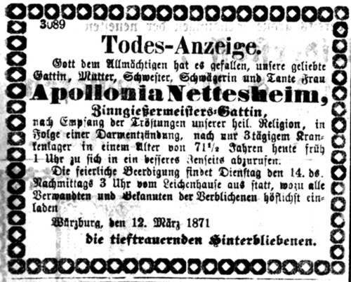 | 1871 | Seine Ehefrau Apollonia Nettesheim stribt am 12. März 1871 mit 71 Jahren. |