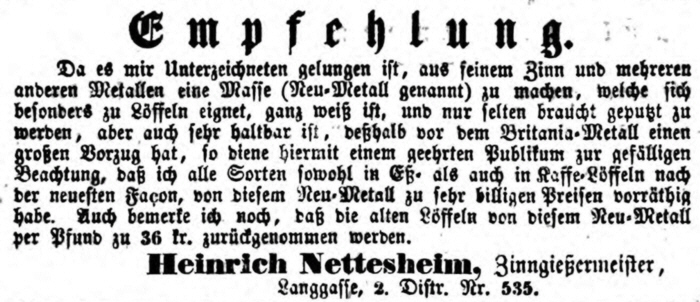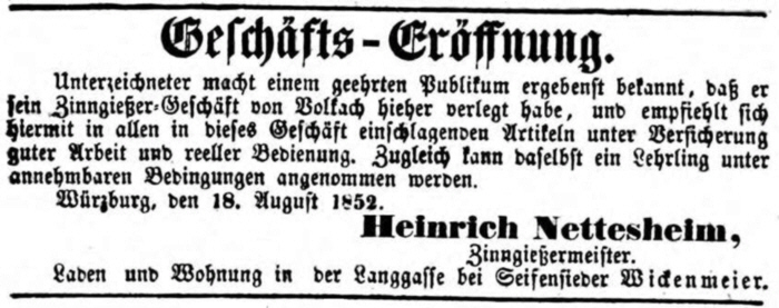 Gerhard Heinrich Nettesheim, der aus Beckum stammt, arbeitet in Würzburg als Geselle bei der Witwe des Zinngießers Philipp Theodor Ruckert von 1829 bis 1832. Er bewirbt sich erfolglos um die Niederlassungskonzession. |