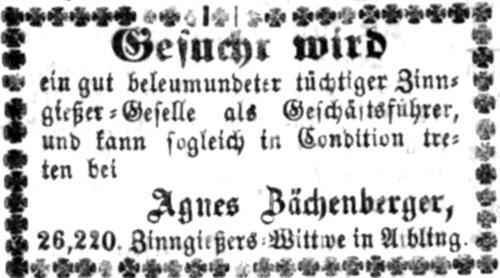 | Quellen: Erwin Hintze: Die Deutschen Zinngießer und Ihre Marken Band V - Süddeutsche Zinngießer, Teil I: Aalen/Kronach, Leipzig, K.W. Hiersemann, 1921 - 1931 Matrikula: Kirchenbücher Bad Aibling-Mariä Himmelfahrt; Garmisch-St. Martin Neueste Nachrichten aus dem Gebiete der Politik vom 12. Mai 1856 (digiPress) Neue Münchener Zeitung-Morgenblatt vom 3. April und 12. Juni 1858 (digiPress) Neueste Nachrichten aus dem Gebiete der Politik vom 22. Septembe 1858 (digiPress) |