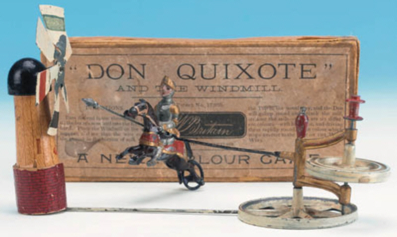herumgaloppiert und mit seiner Lanze eine bunte Windmühle angreift. Dies