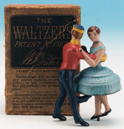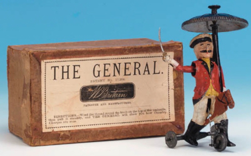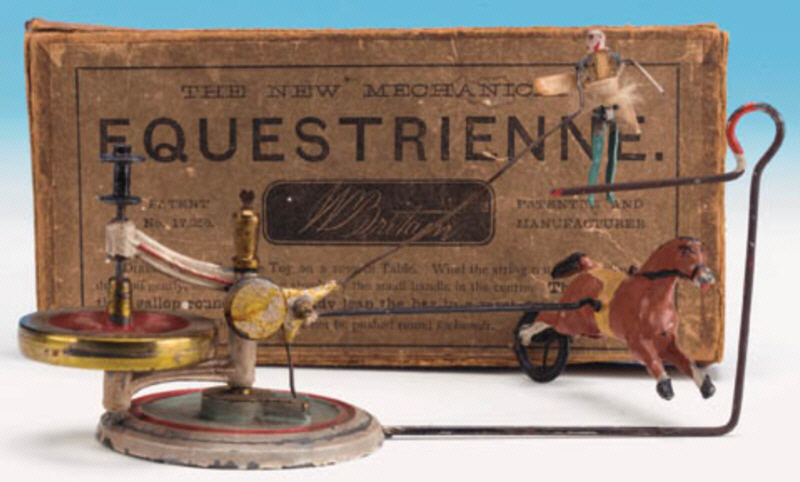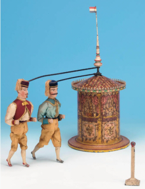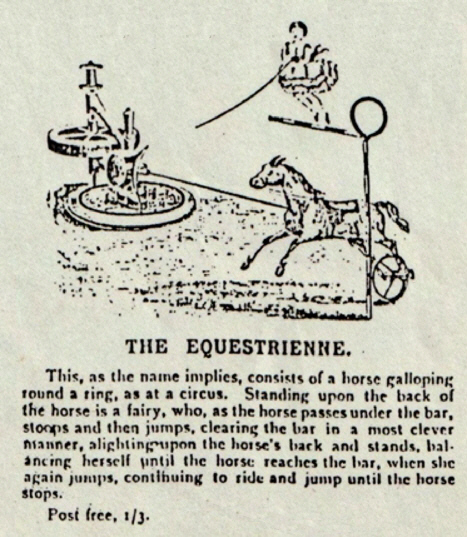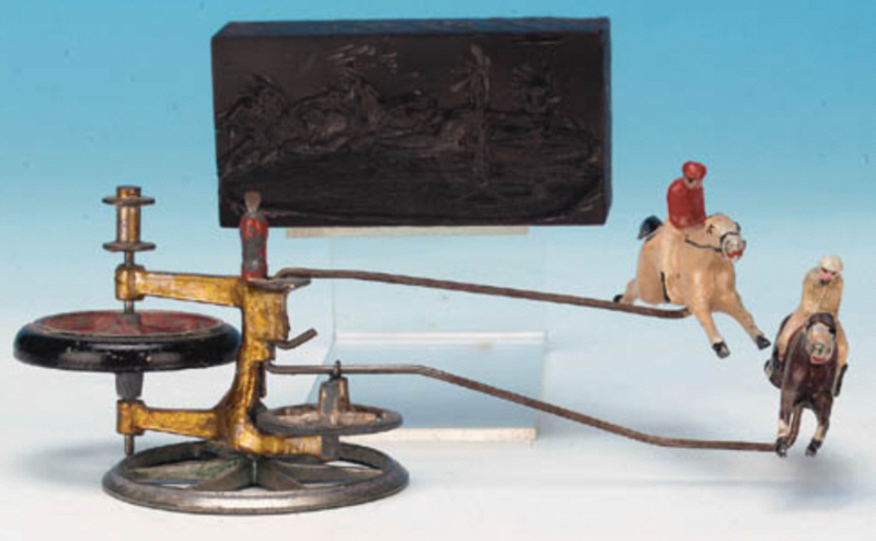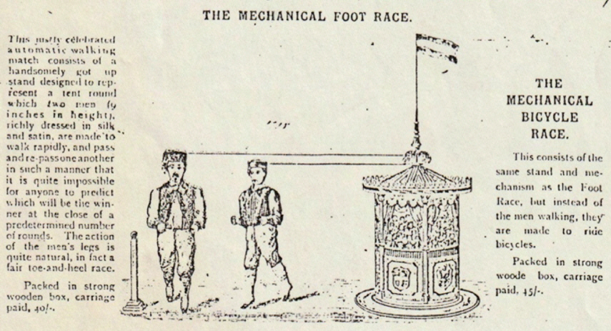 eigentlich ein faires Fersen-Zehen-Rennen. Verpackt in stabiler Holzkiste, frachtfrei 40/-. Es wird auch auf das nicht abgebildete Fahrradrennen hingewiesen: Das mechanische Radrennen - Dieses besteht aus dem gleichen Ständer und Mechanismus wie der Wettlauf, aber statt der Männer, die gehen, sind sie zum Radfahren gemacht. Verpackt in stabiler Holzkiste, frachtfrei 45/-. |