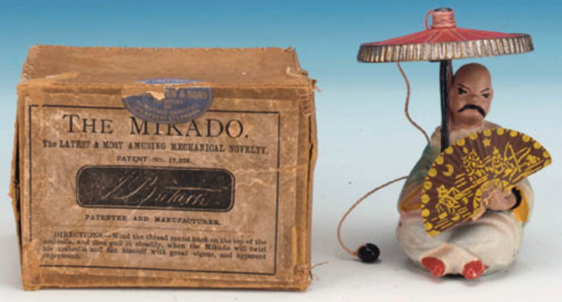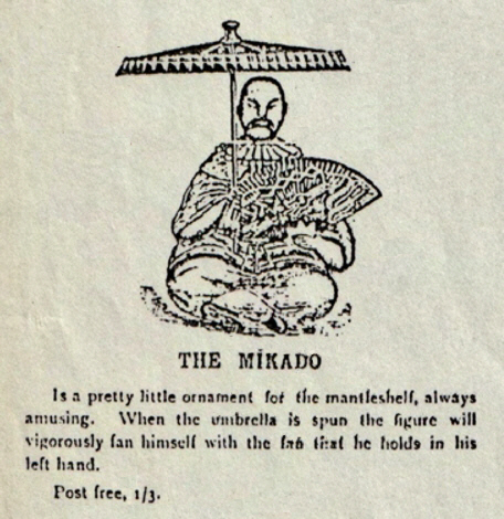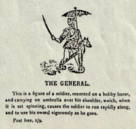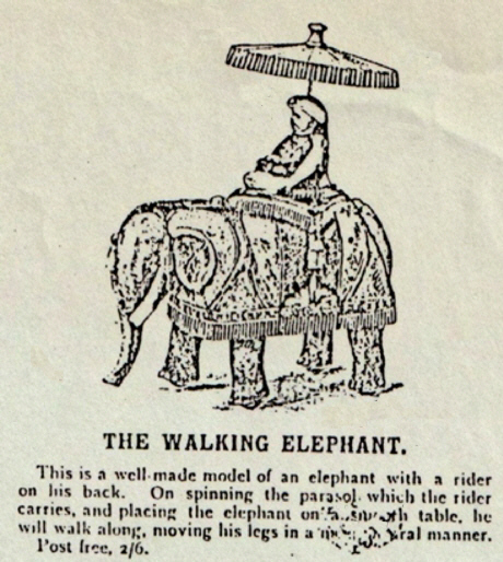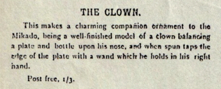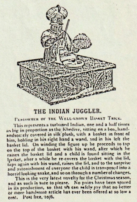 Der indische Jongleur Darsteller des bekannten Korb-Trick Dies stellt einen Inder mit Turban dar, der eineinhalb mal so groß ist wie der Khedive, der auf einer Kiste sitzt, die hübsch mit Seidenplüsch bedeckt ist, meit einem Korb vor sich, in seiner rechten Hand hält er einen Zauberstab und in seiner linken den Korbdeckel. Beim Aufziehen der Figur klopft er mit seinem Zauberstab auf den Korb, hebt den Korbdeckel an und findet ein Kind im Korb sitzend vor, worauf er den Korb wieder mit dem Deckel bedeckt, erneut mit seinem Zauberstab klopft, den Deckel anhebt und zur Überrasching und Verwunderung aller das Kind in eine schrecklich aussehende Schlange verwandelt und so weiter durch eine Reihe von Veränderungen. Dies ist die allerletzte Neuheit für die Weihnachtszeit und wird als solche sicher gefallen. Bei der Herstellung wurden keine Mühen gescheut, sodass wir mit Sicherheit sagen können, dass kein besserer oder schönerer Artikel zu erinem so niedrigen Preis angeboten wird. Portofrei, 10/6. |