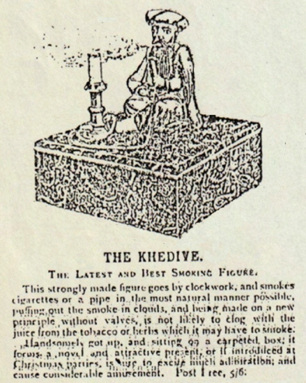 [Groß-Wesir] Die neueste und beste Raucherfigur - Diese solide gemachte Figur läuft mit einem Uhrwerk und raucht Zigaretten oder Pfeife auf die natürlichste Art und Weise, indem sie den Rauch in Wolken ausbläst und nach einem neuen Prinzip hergestellt wird, ohne Ventile ist es unwahrscheinlich mit dem Saft des Tabaks oder der Kräuter, die sie zum Rauchen benötigt, zu verstopfen. Hübsch aufgemacht und auf einer mit Teppich ausgelegten Schachtel platziert, ist es ein originelles und attraktives Geschenk oder wird, wenn es bei Wihnachtsfeiern vorgestellt wird, sicherlich viel Bewunderung erregen und für viel Vergnügen sorgen. Protfrei, 5/6. |